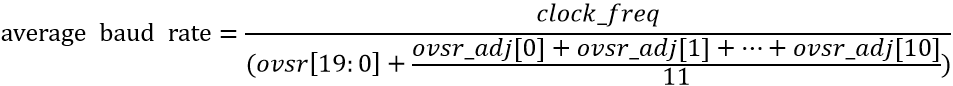 Tx path and Rx path both support fractional baud rate generator. Parameter ovsr[19:0] and ovsr_adj[10:0] are configured depending on IP clock frequency and applied baud rate.