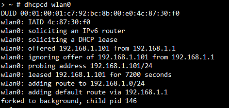 dhcpcd wlan0 用于从 AP 的 DHCP 服务器获取 IP 地址。下图显示了运行 DHCP 客户端并获取 IP 192.168.1.101 的示例。