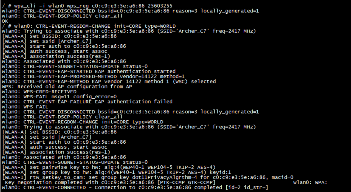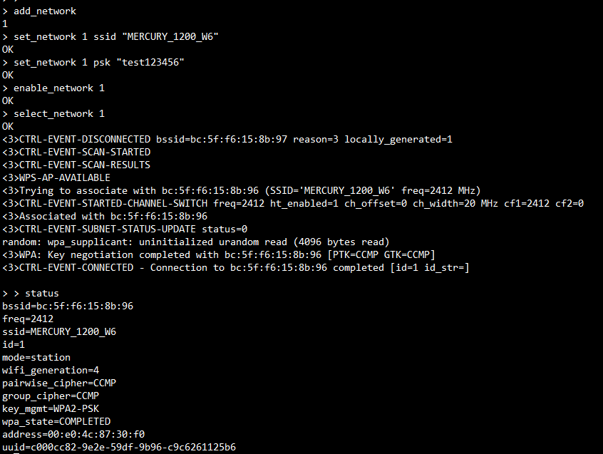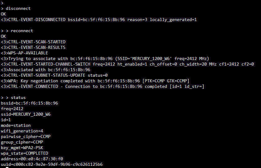 wpa_cli 支持两种模式:交互模式和命令行模式。两种模式使用相同的命令集,主要区别在于交互模式可以访问非请求消息(事件消息、用户名/密码请求)。