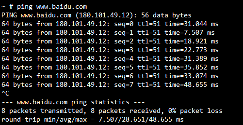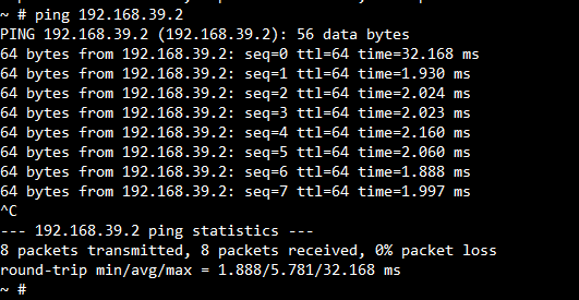系统中的 ping 是 Linux 的经典 ping 工具,使用 ping -h 可以获取帮助信息。下图显示了对 192.168.39.2 的 ping 操作,没有出现数据包丢失。