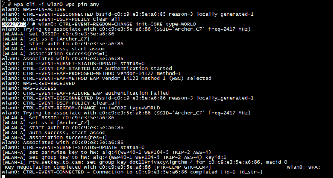 执行以下命令,你将获得一个 PIN 码,或者在这个命令中使用指定的 PIN 值。在路由器中输入该 PIN 码,然后网络配置将从接入点接收并存储在 wpa_supplicant.conf 中。