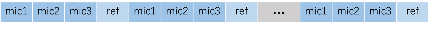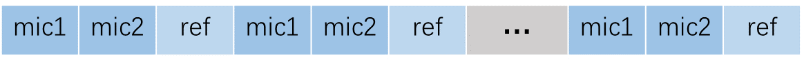 输入音频的 格式 为 16kHz、16 bit、四通道(其中 3 个通道为 mic 数据,另 1 个通道为参考信号)。 若不需要 AEC 功能,则输入为三通道 mic 数据。