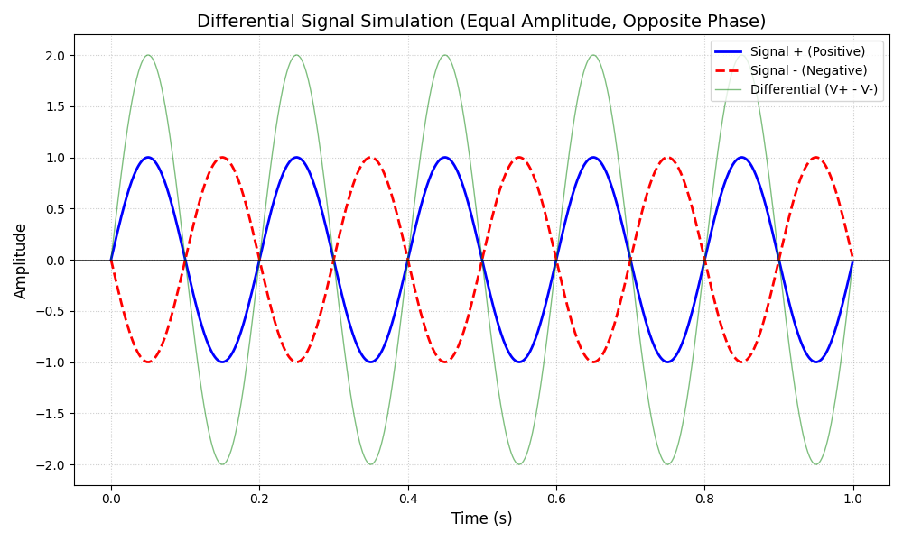 差分信号传输时需要两根信号线,两根信号线上电压幅度相同,相位相反,其差值用来表示逻辑电平 0 和 1,如下图展示了一组标准的差分信号及其差值。