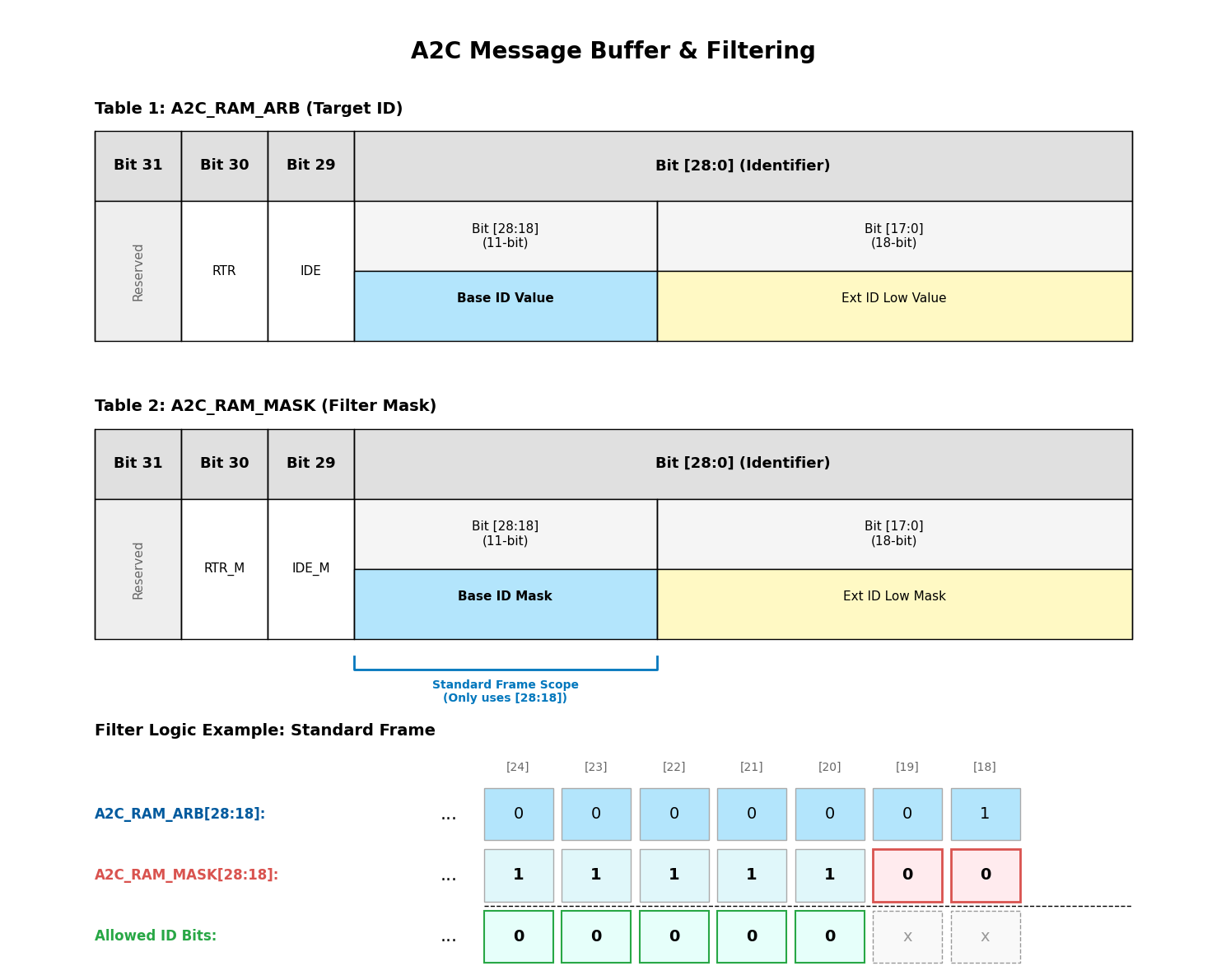 A2C 模块可通过组合设置 接收标识符(ID) 和 接收掩码(Acceptance Mask) ,实现硬件级报文筛选,减轻 CPU 处理非相关报文的负担。