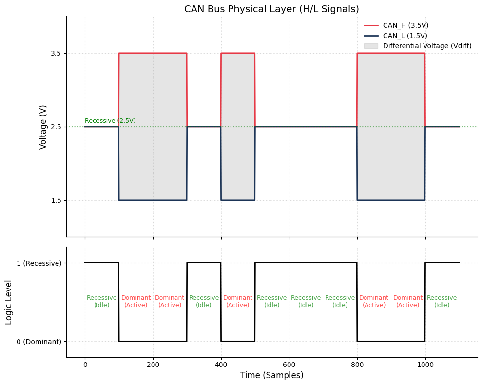 例如,当收发器想要发送控制器传来的逻辑电平 0,它会使 H 信号线输出 3.5V,同时 L 信号线输出 1.5v,从而输出显性电平逻辑 0。