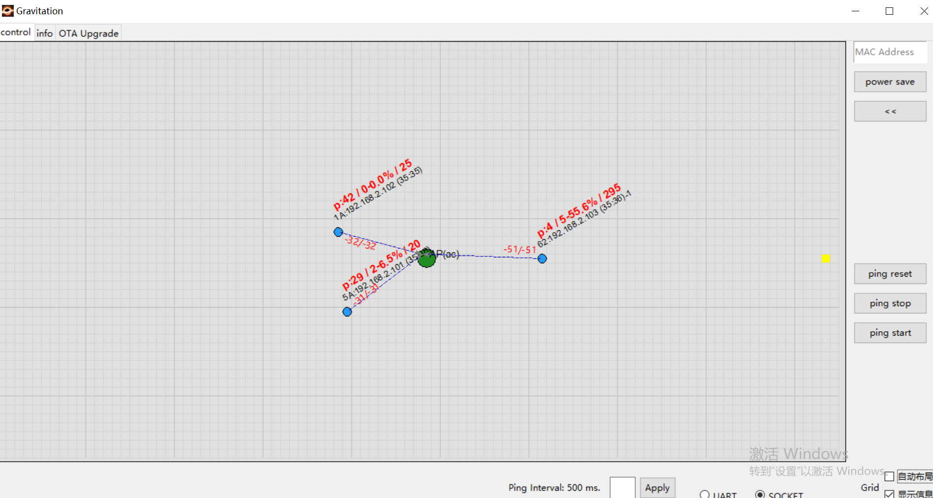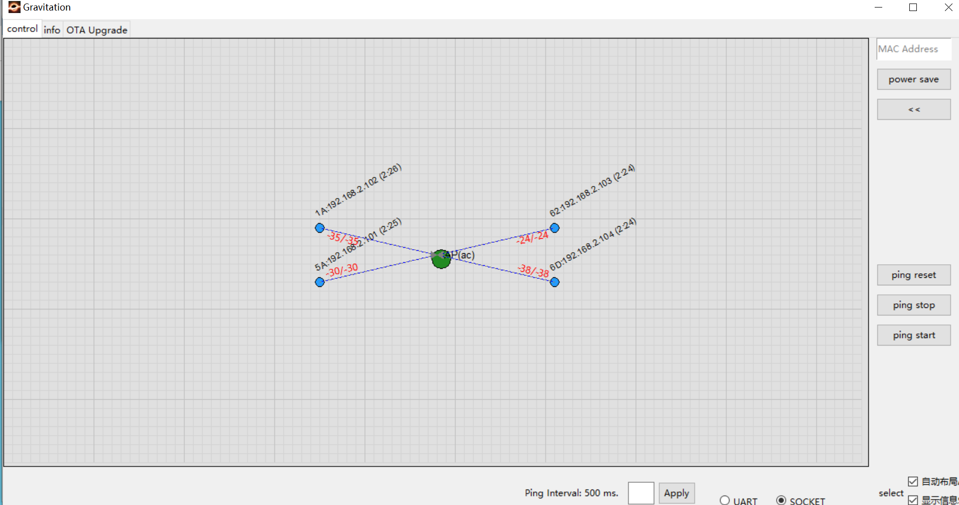 节点加入网络后,会自动发信息给 Gravitation tool,如下图所示有 4 个节点与 AP 连接成功。
