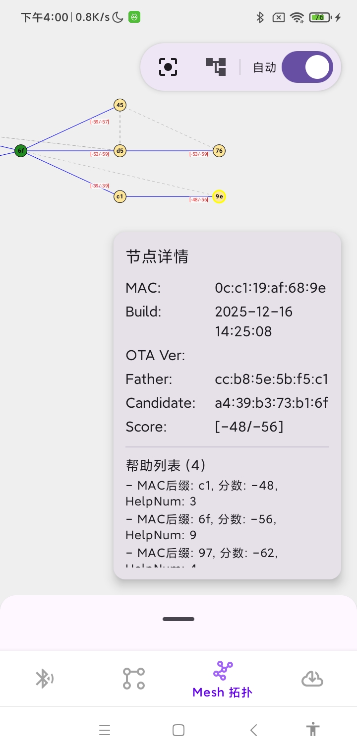 每个节点会显示 MAC_Addr。比如: C1 代表 MAC 地址为 XX:XX:XX:XX:XX:0xC1。节点之间的连线上显示的两个红色数字表示当前父节点的得分以及最优候选节点的得分,该得分是以信号强度为基础计算得到的。