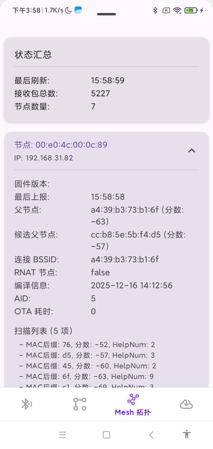 扫描到的附近其他节点的列表,每个节点包含如下信息:该节点 MAC 地址的最后一个 byte,该节点的评分,该节点还可接纳的子节点数量 |