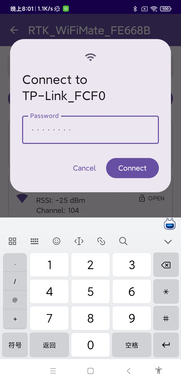 用户在手机上选择要让 R-Mesh 节点加入的 WLAN,并输入其密码,手机将此 WLAN 的 SSID 和密码通过蓝牙发送给 R-Mesh 节点
