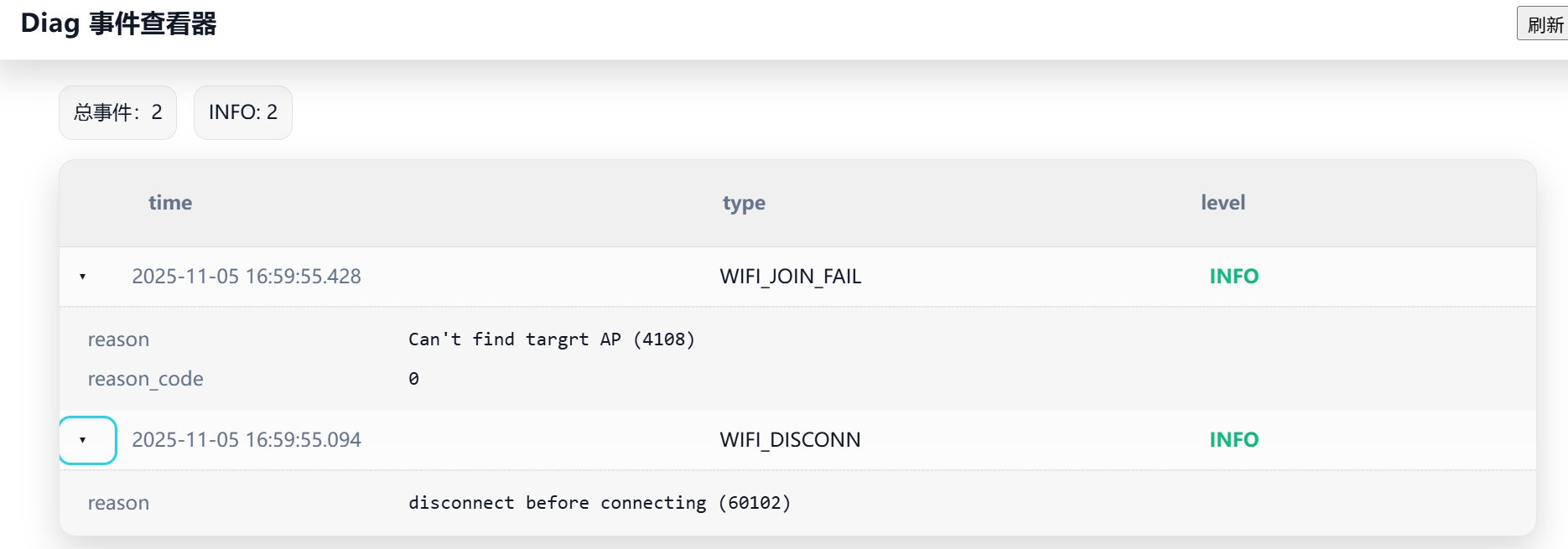 默认支持 Wi-Fi、I2C、DMA 等模块的事件记录(如 Wi-Fi 断线原因、连接失败原因),自定义事件请参考 自定义事件添加。