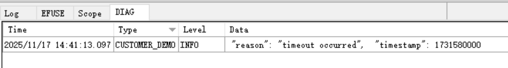 void customer_demo_trigger_handler(void) { struct diag_evt_customer_demo event_data = { .reason = 10002, /* triggered by timeout */ .timestamp = 1731580000U }; RTK_EVENT_I(DIAG_EVT_CUSTOMER_DEMO, (u8 *)&event_data, sizeof(event_data)); }