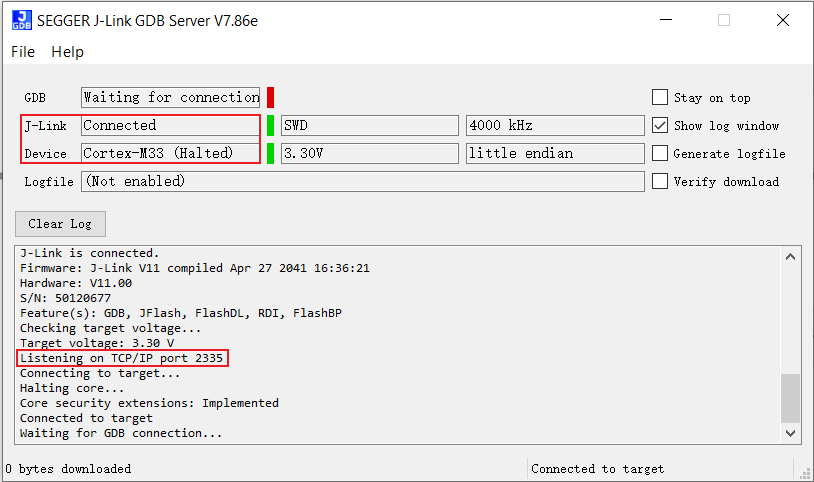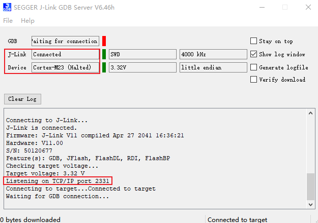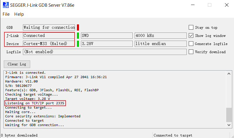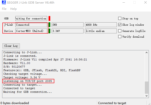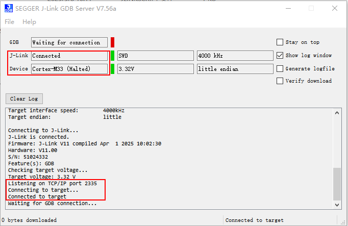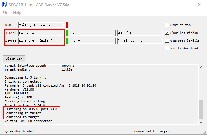 ameba.py jlink -t gdb -k km4ns,如下所示,确认 KM4NS 与 JLinkGDBSever 成功连接。------J-Link related settings------ J-Link Host interface: USB J-Link script: AP1_NP.JLinkScript J-Link settings file: none ------Target related settings------ Target device: Cortex-M33 Target device parameters: none Target interface: SWD Target interface speed: 4000kHz Target endian: little Connecting to J-Link... J-Link is connected. Firmware: J-Link V11 compiled Apr 1 2025 10:02:30 Hardware: V11.00 S/N: 51024332 Feature(s): GDB Checking target voltage... Target voltage: 3.34 V Listening on TCP/IP port 2331 Connecting to target... Halting core... Core security extensions: Not implemented Connected to target Waiting for GDB connection...