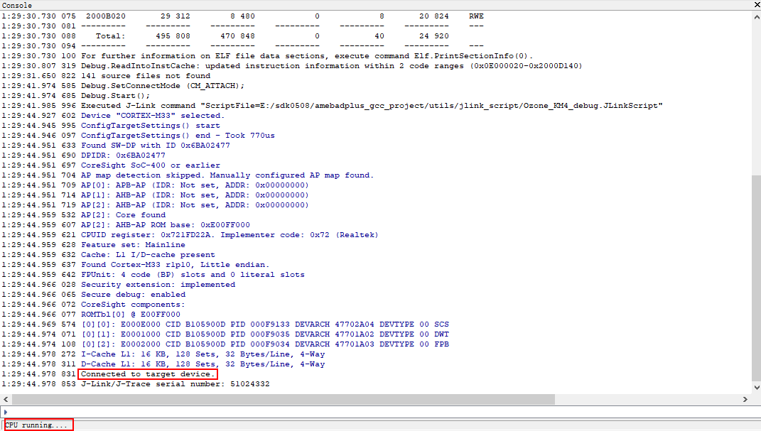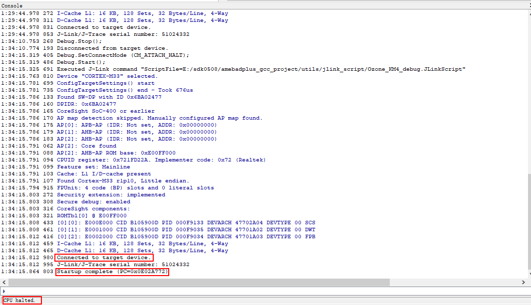 在 SDK 根目录下执行 ameba.py jlink -k ca32_0,按照提示输入 connect 和 回车键(默认值)后,确认 Core0 与 J-Link 成功连接,如下图所示:
