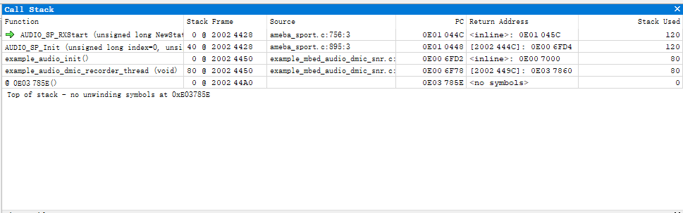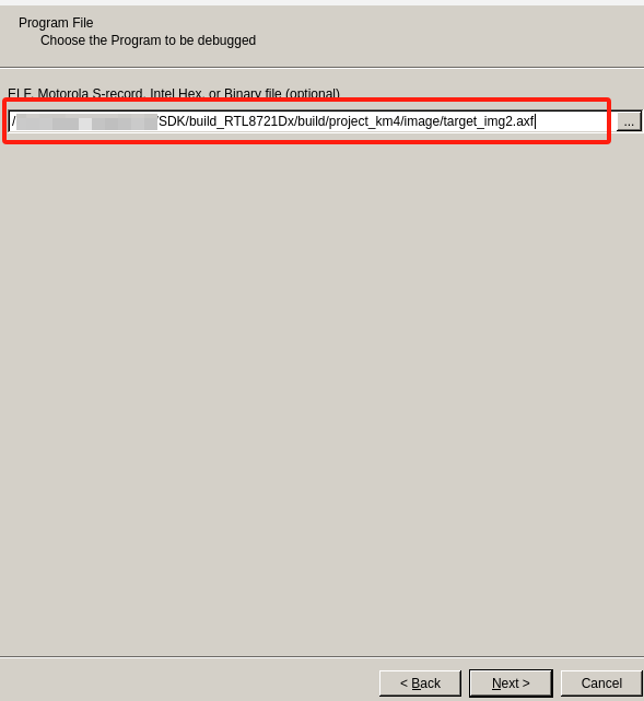 GDB CMD : cd /home/user_name/code/dp1/build_RTL8721Dx/build/project_km4 && /opt/rtk-toolchain/asdk-10.3.1-4523/linux/newlib/bin/arm-none-eabi-gdb -ex 'set $GDB_PORT=2335' -ex 'set $SYSTEM_CTRL_BASE=0x41008000' -ex 'set $REG_LSYS_BOOT_CFG=0x26c' -x /home/user_name/code/dp1/tools/scripts/gnu_script/rtl_gdb_debug.txt GNU gdb (Realtek ASDK-10.3.1 Build 4580) 15.1.90.20240925-git Copyright (C) 2024 Free Software Foundation, Inc. License GPLv3+: GNU GPL version 3 or later <http://gnu.org/licenses/gpl.html> This is free software: you are free to change and redistribute it. There is NO WARRANTY, to the extent permitted by law. Type "show copying" and "show warranty" for details. This GDB was configured as "--host=x86_64-pc-linux --target=arm-none-eabi". Type "show configuration" for configuration details. For bug reporting instructions, please see: <https://www.gnu.org/software/gdb/bugs/>. Find the GDB manual and other documentation resources online at: <http://www.gnu.org/software/gdb/documentation/>. For help, type "help". Type "apropos word" to search for commands related to "word". warning: No executable has been specified and target does not support determining executable automatically. Try using the "file" command. 0x3000a304 in ?? () Notification of completion for asynchronous execution commands is off. (gdb)