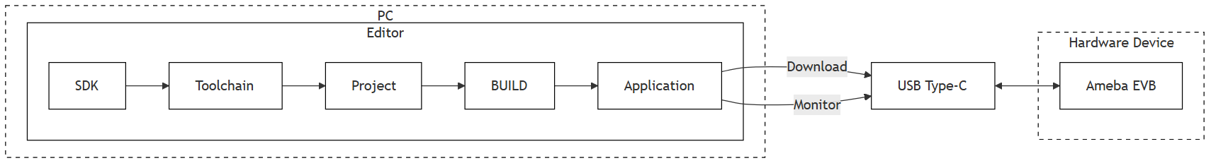 本节介绍如何搭建 Ameba 硬件开发的软件环境,内容涵盖 SDK 获取、开发环境配置、工程编译、固件烧录以及串口日志监控等完整开发流程,帮助开发者快速完成从环境准备到固件运行。