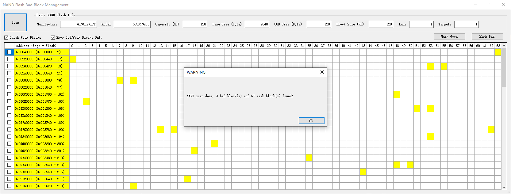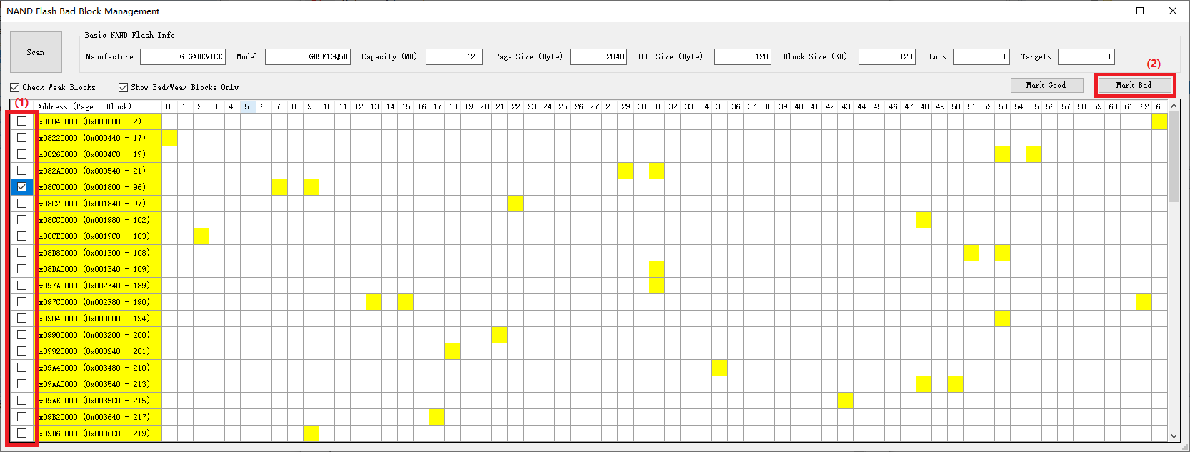 对于坏块,block 的地址单元将标记为红色,而 block 的 page 将不会被标记。