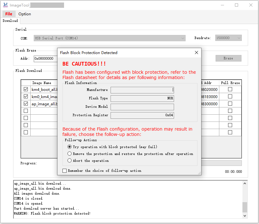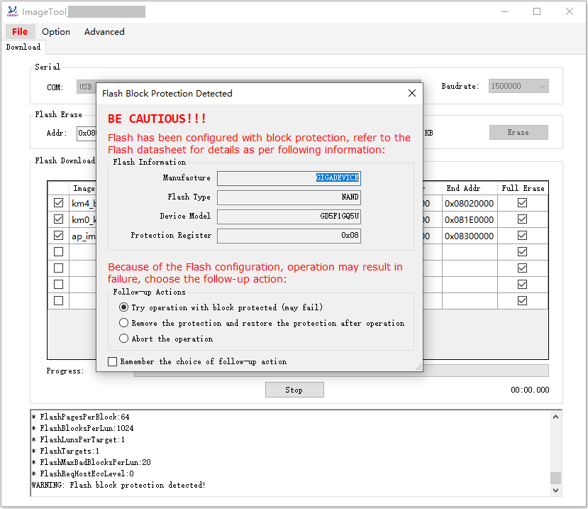 在执行固件烧写或 Flash 擦除操作的过程中,若检测到设备上的 Flash 块存在保护配置,Image Tool 将弹出提示对话框,引导用户选择适当的后续操作。