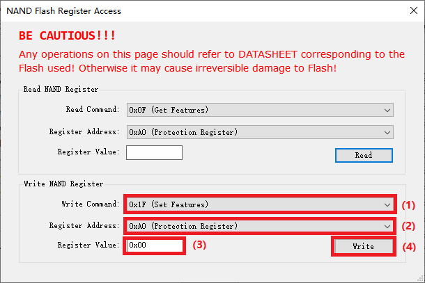 任何 Flash 寄存器操作(特别是写入操作),必须遵循 Flash 的数据手册规范,否则可能导致 Flash 数据丢失甚至损坏。