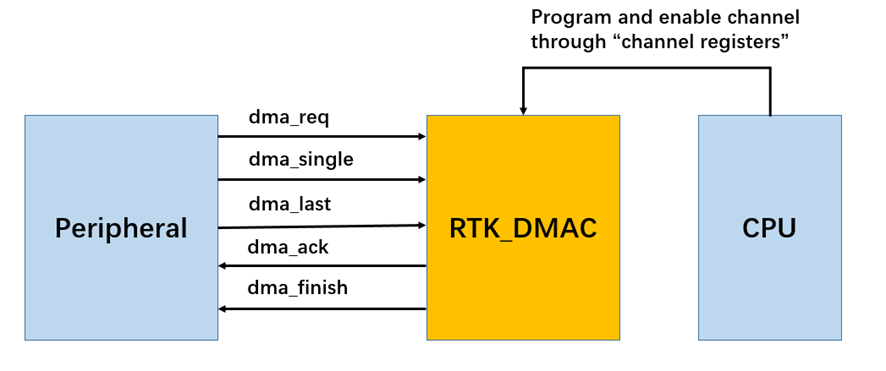 Hardware Request Interface: Provides a dedicated set of hardware handshake signals for interaction with non-memory peripherals. When a peripheral is ready to send or request data, it asserts a hardware request to the DMAC via this interface. The DMAC responds by controlling single or burst transactions according to the protocol.