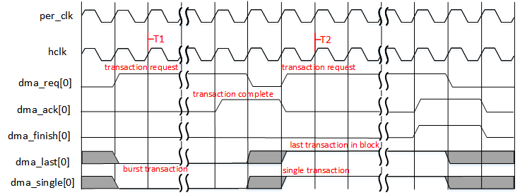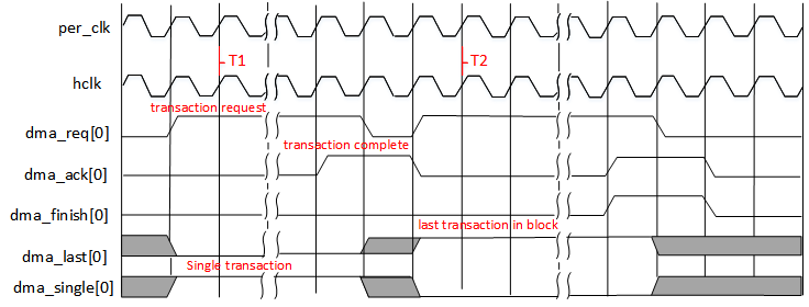 Transactions are the smallest independent actions executed by the DMAC at the hardware level. In non-memory peripheral transfers, transactions strictly define the interaction between the DMAC and peripherals. The hardware supports two transaction types:
