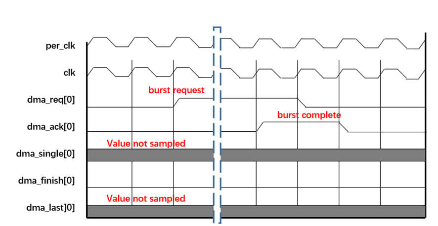 If the transfer data amount is unknown, the peripheral should be configured as the flow controller. The actual amount of data transferred is entirely determined by the peripheral. For example, when the DMA is used to receive variable-length data from a UART, the CPU does not know in advance how many bytes will be sent, so the UART peripheral should act as the flow controller. When a UART idle timeout or similar event occurs, the peripheral asserts the dma_last signal to the DMAC to terminate the current block transfer.