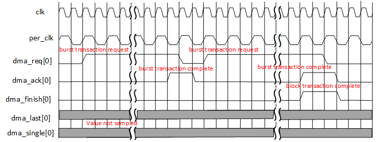 Burst Transaction: Configured via software (CTLx.SRC_MSIZE / CTLx.DEST_MSIZE). The DMAC translates this into a series of AXI incremental bursts or single transactions, ensuring no single AXI burst exceeds the maximum configured size. The burst length must match the FIFO depths of the DMAC and the peripheral.