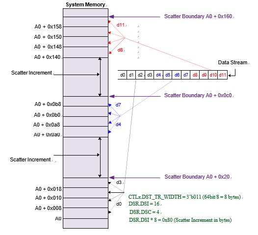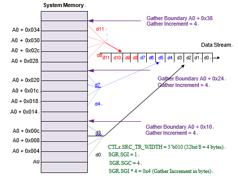 Supports Scatter/Gather transfer mode (Channels 0 ~ 3 only), allowing automatic processing of non-contiguous memory-mapped regions in a single DMA transfer.