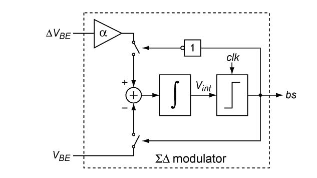 As a result of the feedback in the modulator, the average input to the integrator is zero. In other words, the charge added by α * ΔV_BE is balanced by the charge removed by -V_BE.